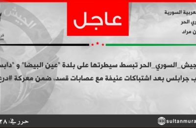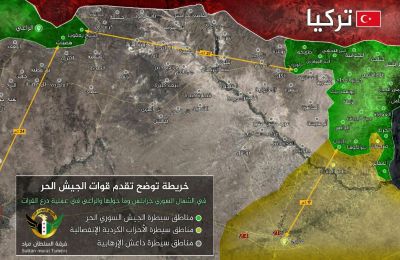 FIRAT KALKANI İLE ÖZGÜRLEŞEN CARABLUS DAN HEMEN SONRA CEVRE KÖYLERE DÜZENLENEN OPARASYON İLE 6 KÖY PYD VE DEAŞ ÇETELERİNDEN TEMİZLENDİ.İLERLEMEMİZ ALLAHIN İZNİ İLE DEVAM ETMEKTEDİR. ALLAH YAR VE YARDIMCIMIZ OLSUN AMİ…